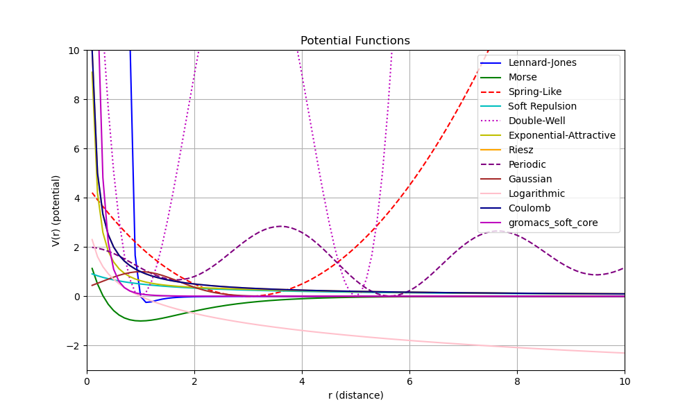 A common potential function used in molecular dynamics and lattice formation with equilibrium distances is the Lennard-Jones potential function: